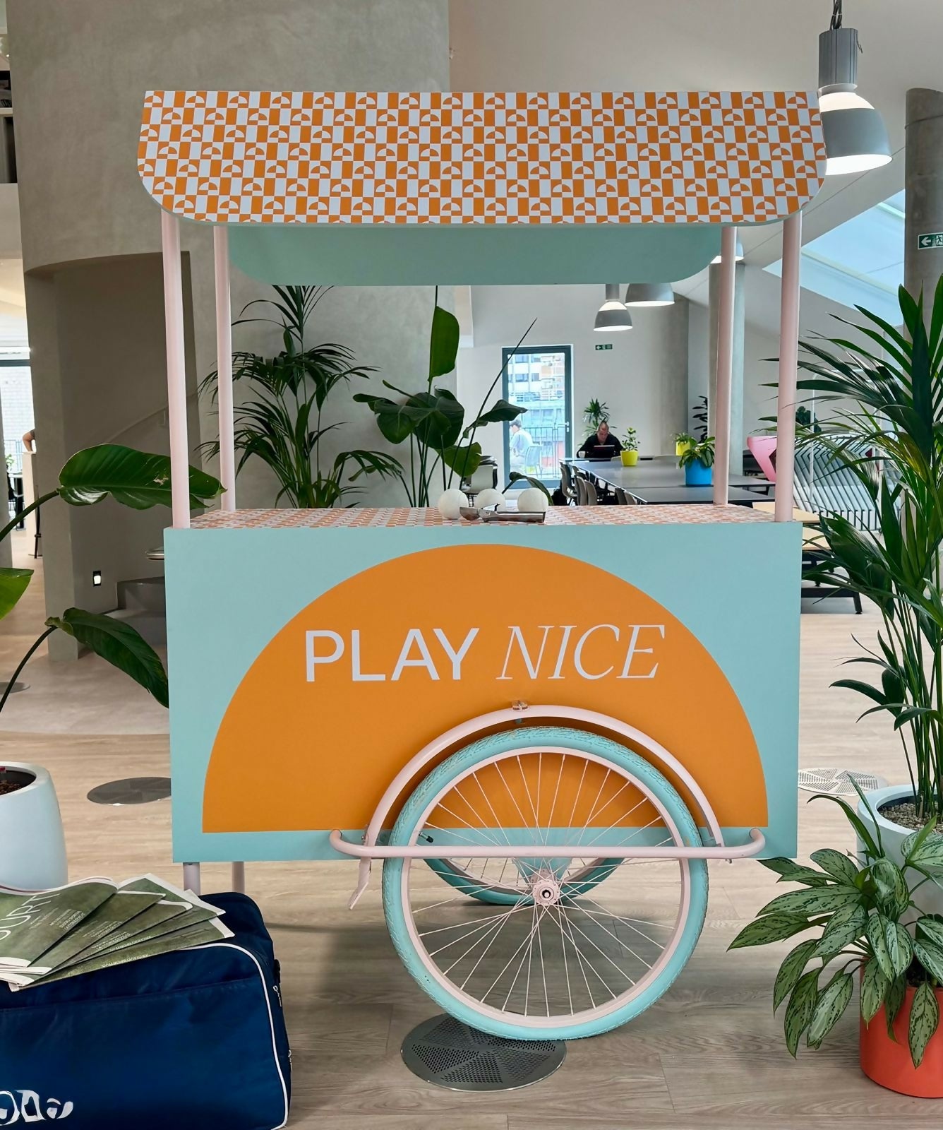 This product is a bespoke faux ice-cream cart, made from MDF and featuring a pastel blue spray paint finish, removable vinyls, 2 matching wheels, and a stand. It is NOT fully functional and is for display purposes only.